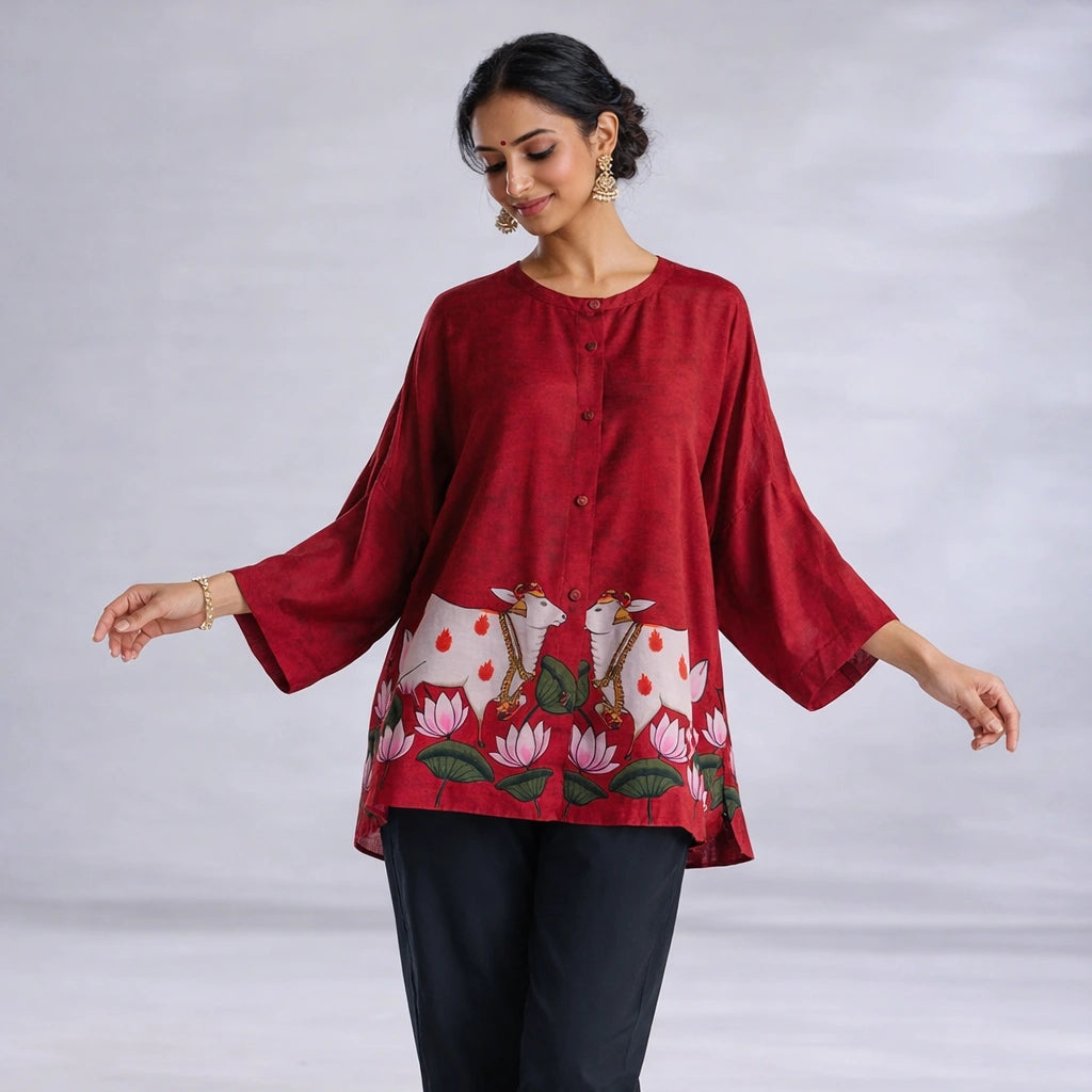 Surbhi Kalamkari Oversized Cotton Shirt for Women – Blood Red